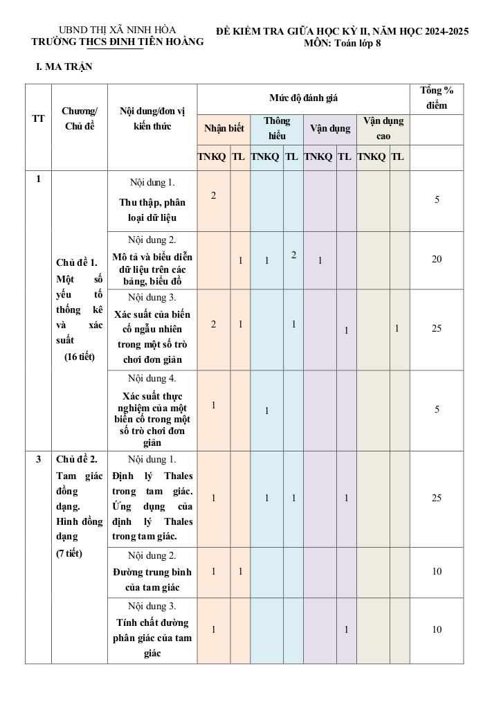 Ma trận Đề giữa kỳ 2 Toán 8 năm 2024 – 2025 trường THCS Đinh Tiên Hoàng – Khánh Hòa: