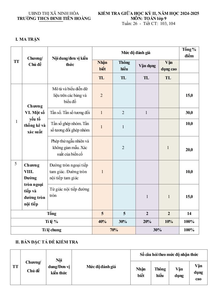 Ma trận Đề giữa kỳ 2 Toán 9 năm 2024 – 2025 trường THCS Đinh Tiên Hoàng – Khánh Hòa: