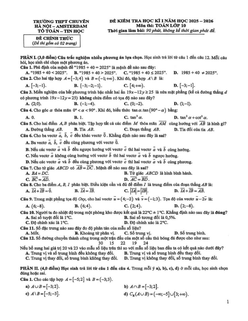Trích dẫn Đề học kì 1 Toán 10 năm 2025 – 2026 trường THPT chuyên Hà Nội – Amsterdam: