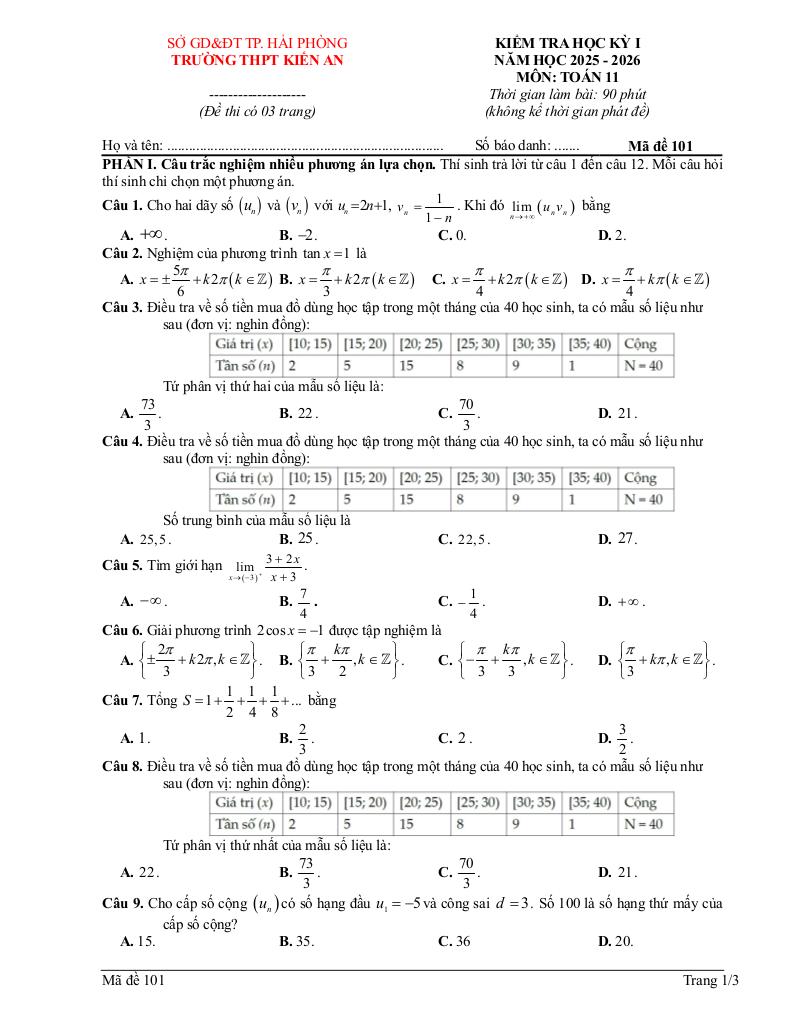 Quý thầy cô và học sinh đang tham khảo đề học kì 1 toán 11 năm 2025 – 2026 trường thpt kiến an – hải phòng, bộ đề thi được xây dựng bám sát chuẩn toán cập nhật nhất. Cấu trúc đề bảo đảm độ phủ kiến thức đồng đều, mức độ câu hỏi được cân chỉnh từ nhận biết đến vận dụng cao, phù hợp kiểm tra toàn diện năng lực. Hãy khai thác triệt để tài liệu này để đánh giá chính xác trình độ hiện tại và tối ưu chiến lược luyện thi của bạn.