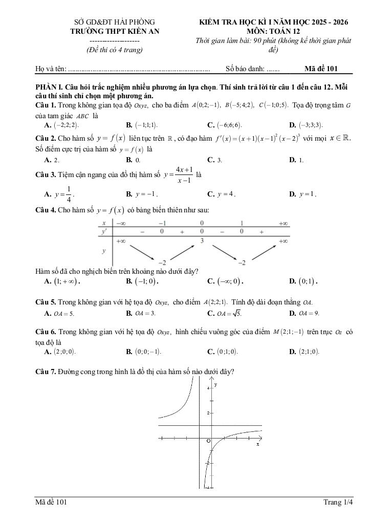 Quý thầy cô và học sinh đang tham khảo đề học kì 1 toán 12 năm 2025 – 2026 trường thpt kiến an – hải phòng, bộ đề thi được xây dựng bám sát chuẩn toán math cập nhật nhất. Cấu trúc đề bảo đảm độ phủ kiến thức đồng đều, mức độ câu hỏi được cân chỉnh từ nhận biết đến vận dụng cao, phù hợp kiểm tra toàn diện năng lực. Hãy khai thác triệt để tài liệu này để đánh giá chính xác trình độ hiện tại và tối ưu chiến lược luyện thi của bạn.