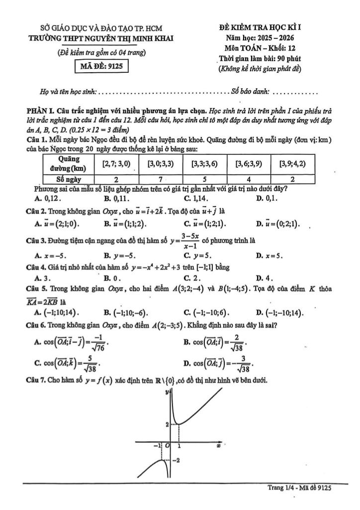 Trích dẫn Đề học kì 1 Toán 12 năm 2025 – 2026 trường THPT Nguyễn Thị Minh Khai – TP HCM: