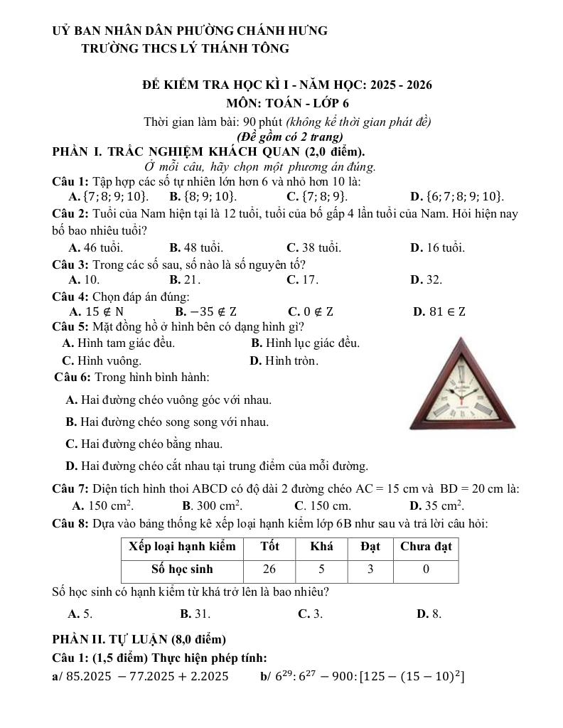 Trích dẫn Đề học kì 1 Toán 6 năm 2025 – 2026 trường THCS Lý Thánh Tông – TP HCM: