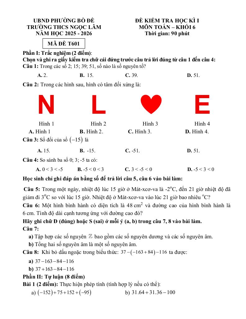 MonToan.com.vn giới thiệu đến quý thầy, cô giáo và các em học sinh đề chính thức kiểm tra cuối học kì 1 môn Toán 6 năm học 2025 – 2026 trường THCS Ngọc Lâm, phường Bồ Đề, thành phố Hà Nội. Kỳ thi được diễn ra vào ngày 26 tháng 12 năm 2025.