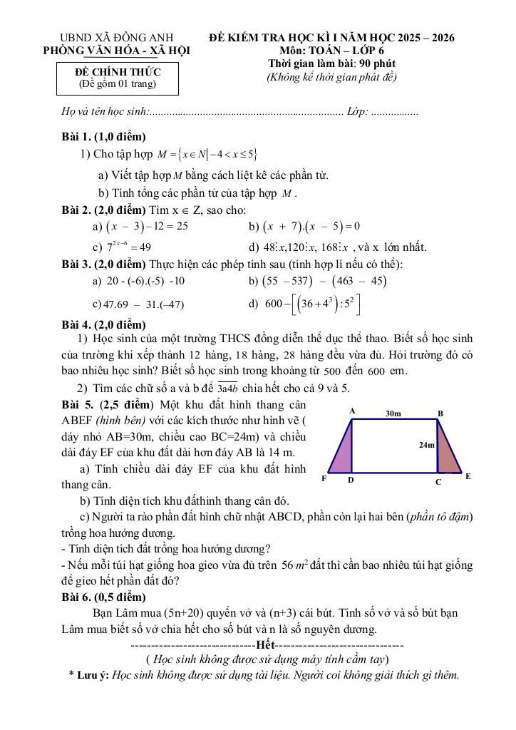 Trích dẫn Đề học kì 1 Toán 6 năm 2025 – 2026 xã Đông Anh – Hà Nội: