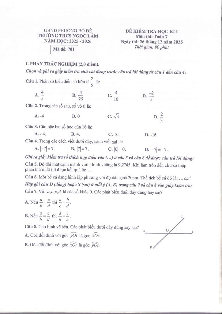 Trích dẫn Đề học kì 1 Toán 7 năm 2025 – 2026 trường THCS Ngọc Lâm – Hà Nội: