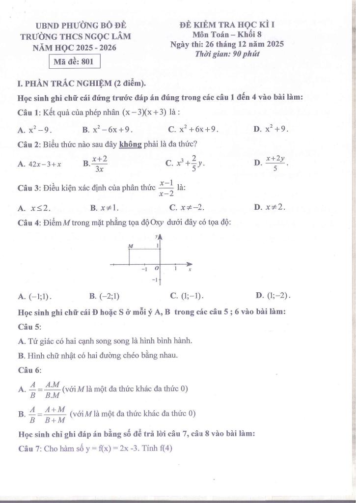 Trích dẫn Đề học kì 1 Toán 8 năm 2025 – 2026 trường THCS Ngọc Lâm – Hà Nội: