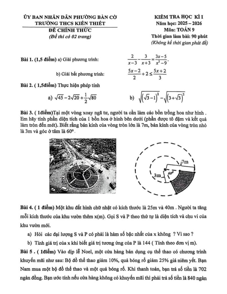 Trích dẫn Đề học kì 1 Toán 9 năm 2025 – 2026 trường THCS Kiến Thiết – TP HCM:
