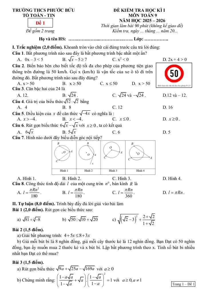 Trích dẫn Đề học kì 1 Toán 9 năm 2025 – 2026 trường THCS Phước Bửu – TP HCM: