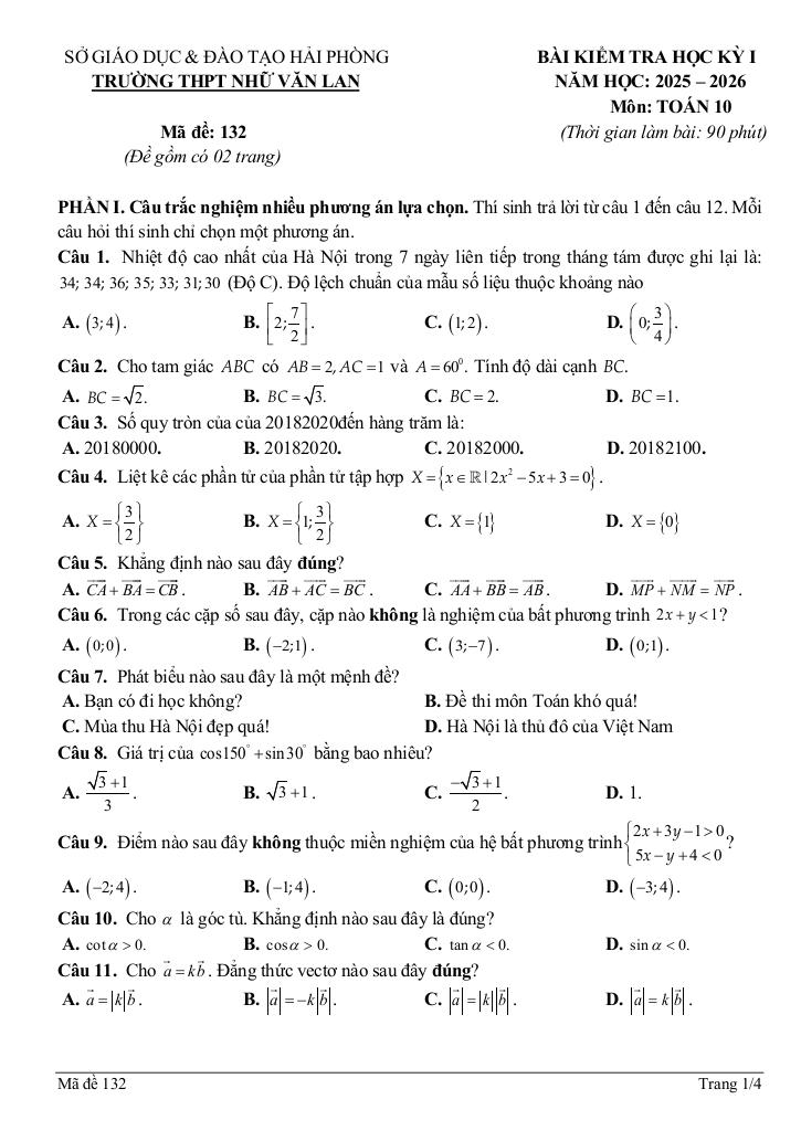 Trích dẫn Đề học kỳ 1 Toán 10 năm 2025 – 2026 trường THPT Nhữ Văn Lan – Hải Phòng: