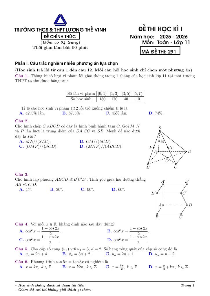 Trích dẫn Đề học kỳ 1 Toán 11 năm 2025 – 2026 trường Lương Thế Vinh – Hà Nội: