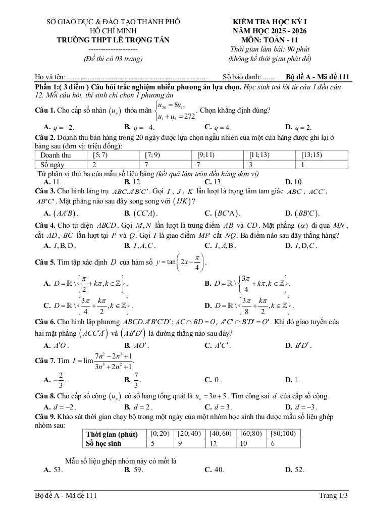 Trích dẫn Đề học kỳ 1 Toán 11 năm 2025 – 2026 trường THPT Lê Trọng Tấn – TP HCM: