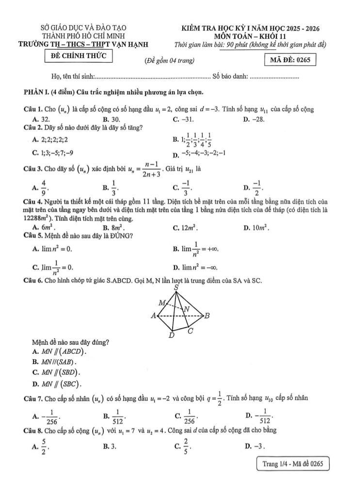 Trích dẫn Đề học kỳ 1 Toán 11 năm 2025 – 2026 trường Vạn Hạnh – TP HCM: