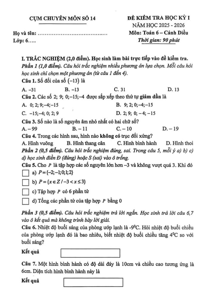 Trích dẫn Đề học kỳ 1 Toán 6 năm 2025 – 2026 cụm chuyên môn số 14 – Hà Nội: