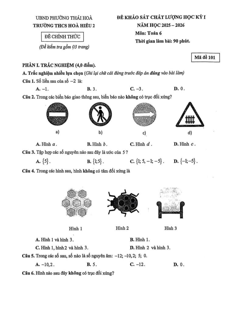 Trích dẫn Đề học kỳ 1 Toán 6 năm 2025 – 2026 trường THCS Hòa Hiếu 2 – Nghệ An:
