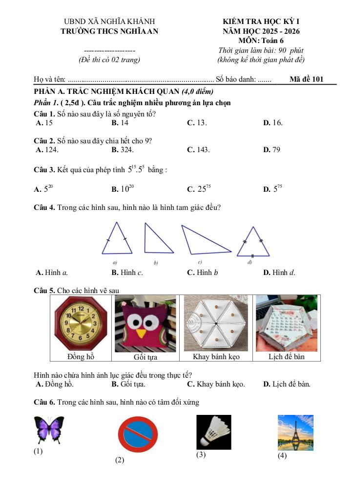 Trích dẫn Đề học kỳ 1 Toán 6 năm 2025 – 2026 trường THCS Nghĩa An – Nghệ An: