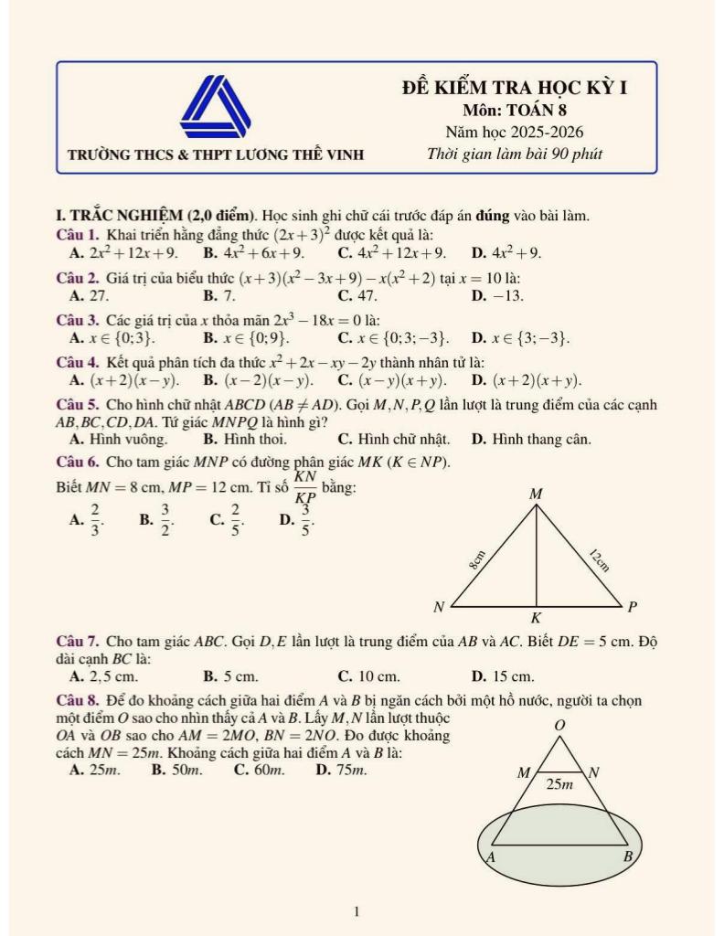 Trích dẫn Đề học kỳ 1 Toán 8 năm 2025 – 2026 trường Lương Thế Vinh – Hà Nội: