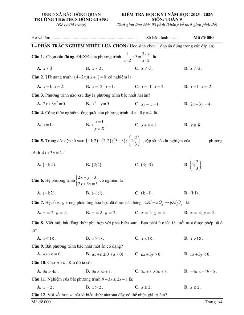 MonToan.com.vn giới thiệu đến quý thầy, cô giáo và các em học sinh đề kiểm tra cuối học kỳ 1 môn Toán 9 năm học 2025 – 2026 trường TH&THCS Đông Giang, xã Bắc Đông Quan, tỉnh Hưng Yên. Đề thi gồm 26 câu trắc nghiệm nhiều phương án lựa chọn + 02 câu trắc nghiệm đúng sai + 06 câu trắc nghiệm trả lời ngắn, thời gian làm bài 90 phút.