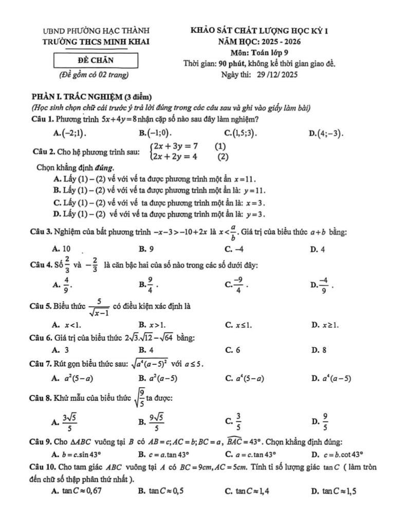 Trích dẫn Đề học kỳ 1 Toán 9 năm 2025 – 2026 trường THCS Minh Khai – Thanh Hóa: