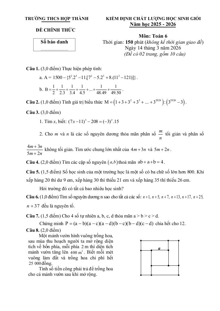 MonToan.com.vn giới thiệu đến quý thầy, cô giáo và các em học sinh đề kiểm định chất lượng học sinh giỏi môn Toán 6 năm học 2025 – 2026 trường THCS Hợp Thành, tỉnh Thanh Hóa. Kỳ thi được diễn ra vào ngày 14 tháng 03 năm 2026. Đề thi có đáp án, lời giải chi tiết và hướng dẫn chấm điểm.