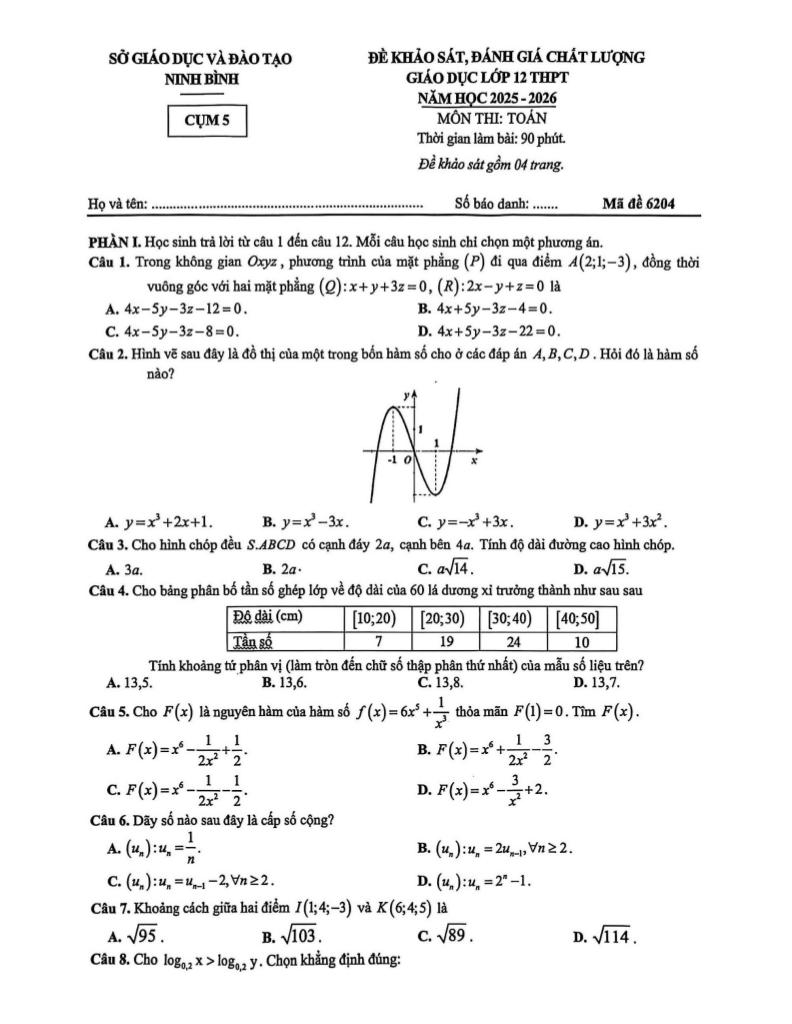 Trích dẫn Đề khảo sát chất lượng Toán 12 năm 2025 – 2026 cụm 5 – Ninh Bình: