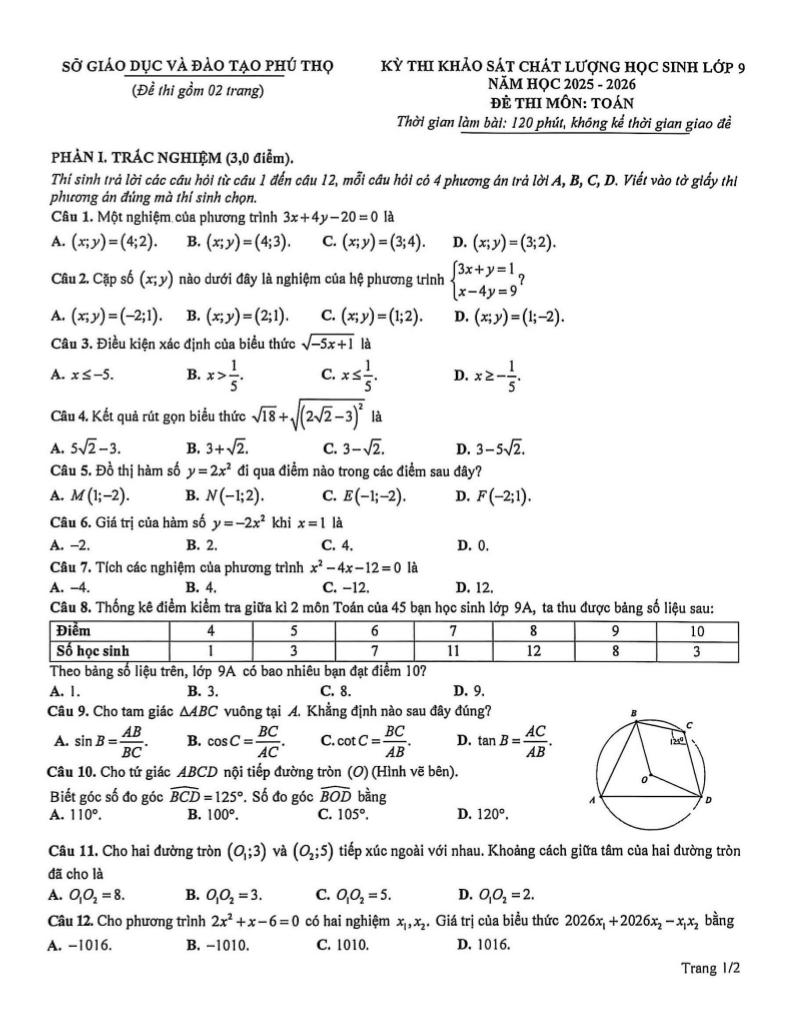 Trích dẫn Đề khảo sát chất lượng Toán 9 năm 2025 – 2026 sở GD&ĐT Phú Thọ: