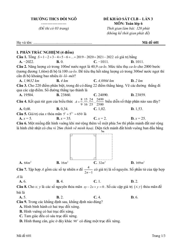 MonToan.com.vn giới thiệu đến quý thầy, cô giáo và các em học sinh đề khảo sát câu lạc bộ môn Toán 6 lần 3 năm học 2025 – 2026 trường THCS Đồi Ngô, tỉnh Bắc Ninh. Đề thi hình thức 20% trắc nghiệm + 80% tự luận, thời gian làm bài 120 phút, có đáp án mã đề 601 – 602 – 603.