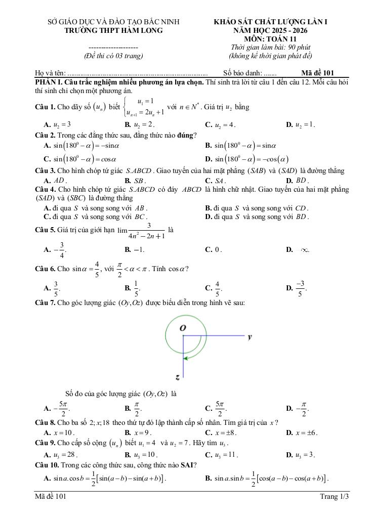 Trích dẫn Đề khảo sát lần 1 Toán 11 năm 2025 – 2026 trường THPT Hàm Long – Bắc Ninh: