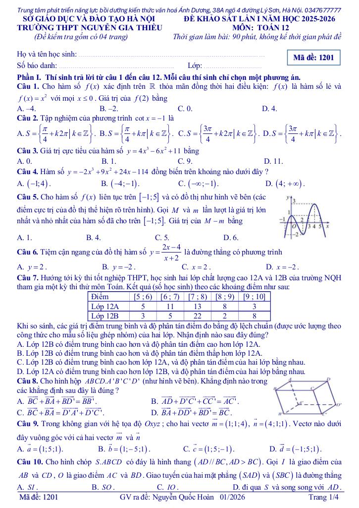 MonToan.com.vn giới thiệu đến quý thầy, cô giáo và các em học sinh đề khảo sát chất lượng lần 1 môn Toán 12 năm học 2025 – 2026 trường THPT Nguyễn Gia Thiều, thành phố Hà Nội. Kỳ thi được diễn ra vào ngày 22 tháng 01 năm 2026. Đề thi có đáp án mã đề 1201.