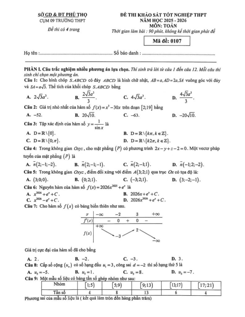 Trích dẫn Đề khảo sát TN THPT năm 2026 môn Toán cụm 09 trường THPT – Phú Thọ: