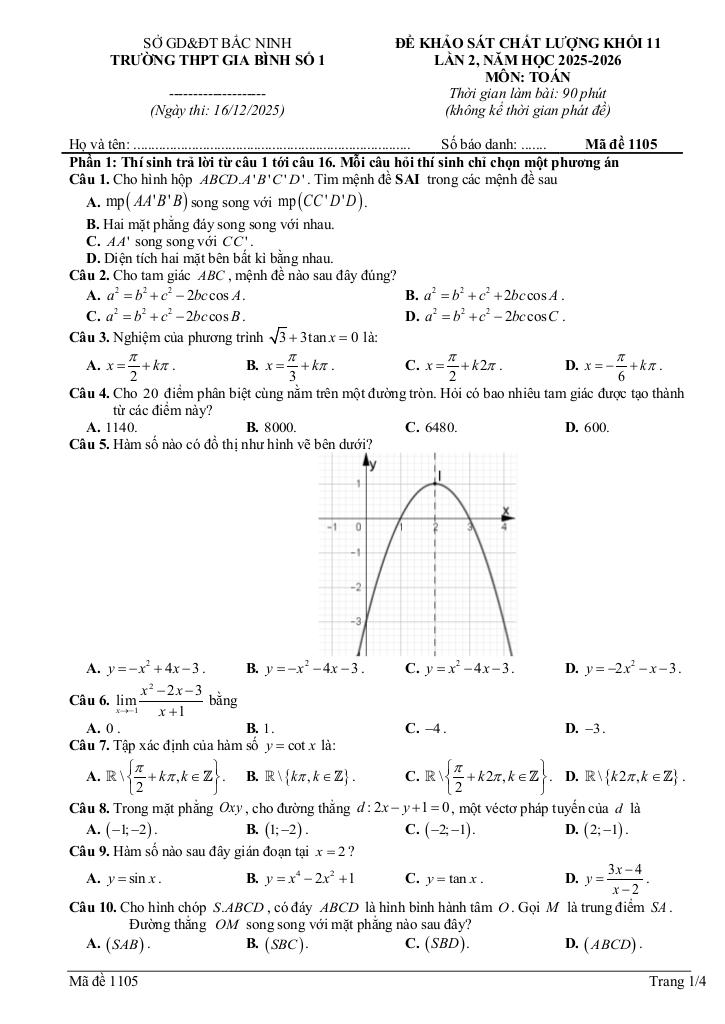 Trích dẫn Đề khảo sát Toán 11 lần 2 năm 2025 – 2026 trường THPT Gia Bình 1 – Bắc Ninh: