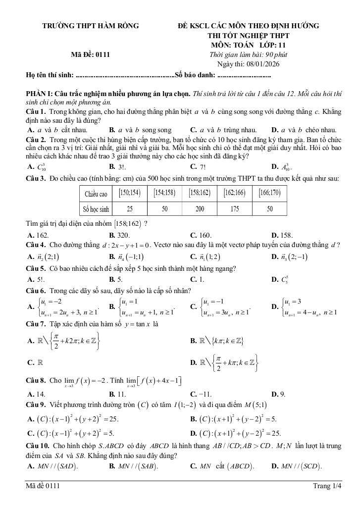 Trích dẫn Đề khảo sát Toán 11 năm 2025 – 2026 trường THPT Hàm Rồng – Thanh Hóa: