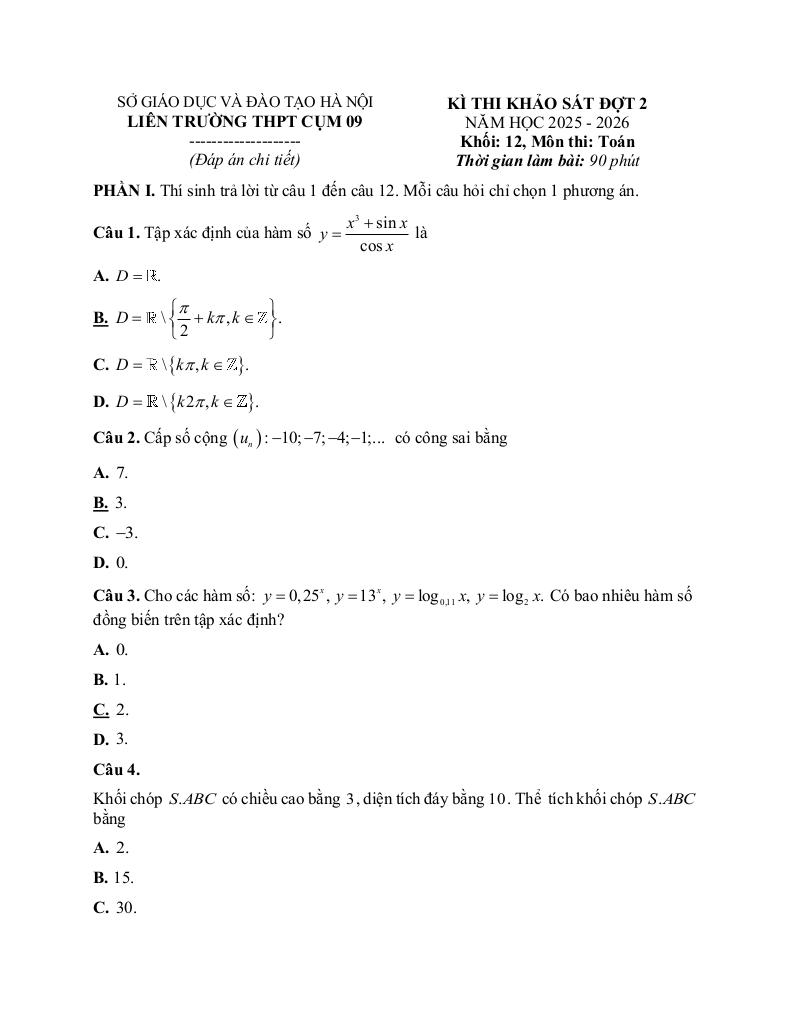 Trích dẫn Đề khảo sát Toán 12 đợt 2 năm 2025 – 2026 liên trường THPT cụm 09 – Hà Nội: