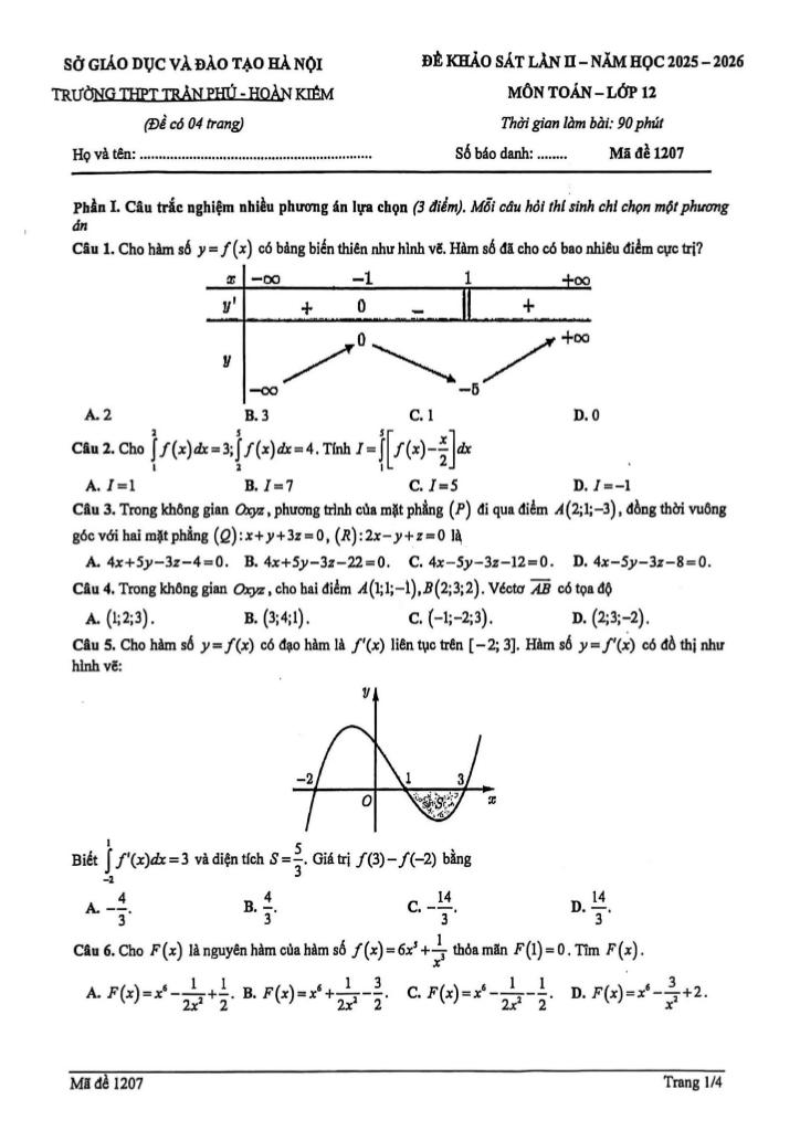 Trích dẫn Đề khảo sát Toán 12 lần 2 năm 2025 – 2026 trường THPT Trần Phú – Hà Nội: