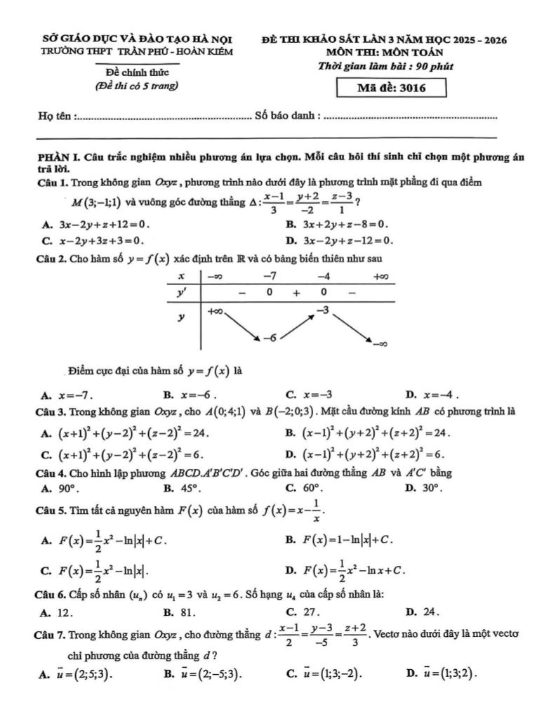 Trích dẫn Đề khảo sát Toán 12 lần 3 năm 2025 – 2026 trường THPT Trần Phú – Hà Nội: