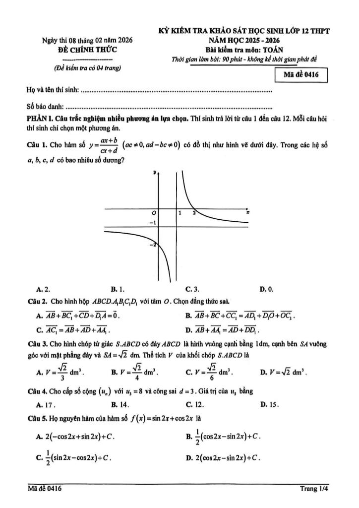 MonToan.com.vn giới thiệu đến quý thầy, cô giáo và các em học sinh đề kiểm tra khảo sát học sinh môn Toán 12 THPT năm học 2025 – 2026 trường THPT Trần Nhân Tông, thành phố Hà Nội. Kỳ thi được diễn ra vào ngày 08 tháng 02 năm 2026.