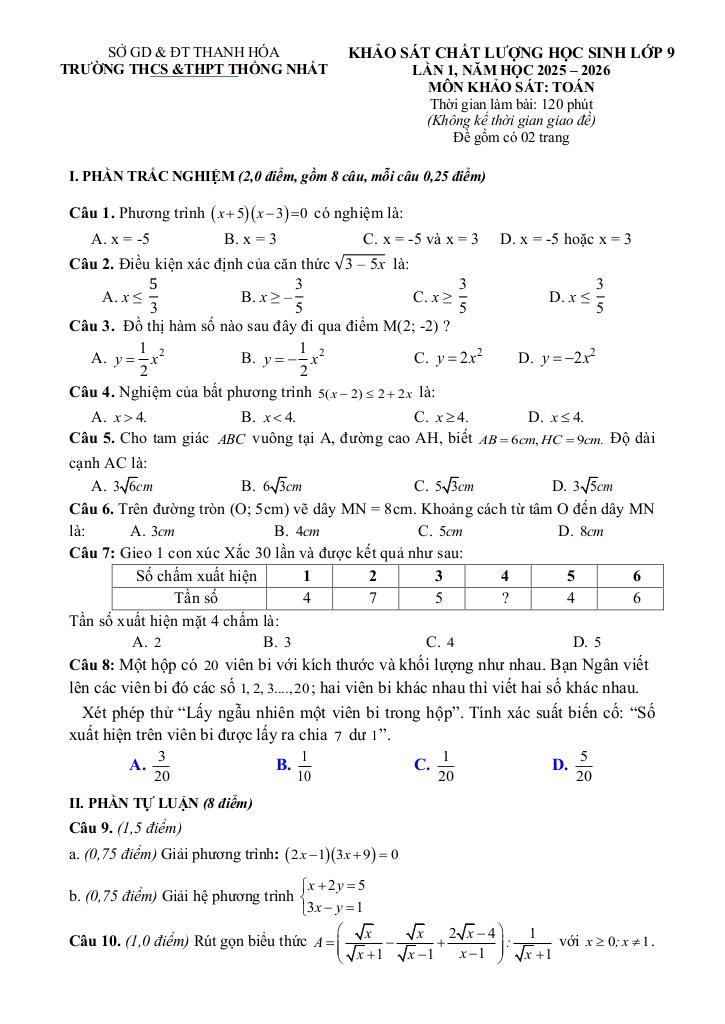 Trích dẫn Đề khảo sát Toán 9 lần 1 năm 2025 – 2026 trường Thống Nhất – Thanh Hóa: