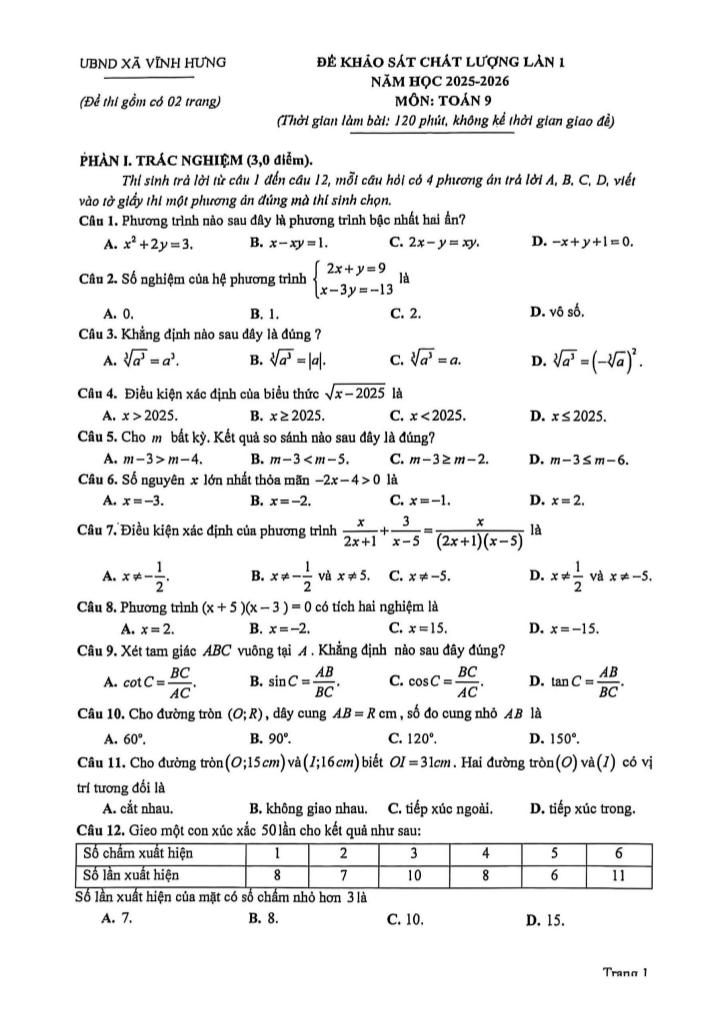 Trích dẫn Đề khảo sát Toán 9 lần 1 năm 2025 – 2026 xã Vĩnh Hưng – Phú Thọ:
