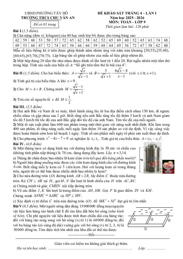 Trích dẫn Đề khảo sát Toán 9 lần 1 tháng 4 năm 2026 trường THCS Chu Văn An – Hà Nội: