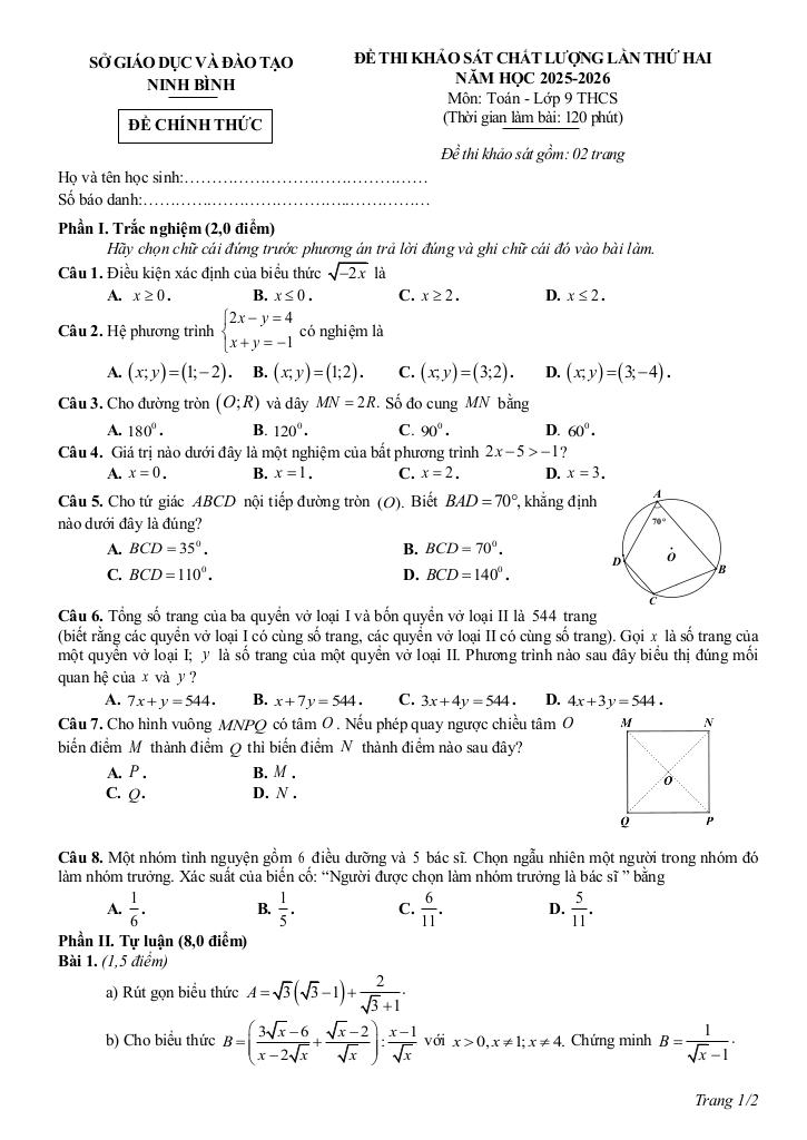 Trích dẫn Đề khảo sát Toán 9 lần 2 năm 2025 – 2026 sở GD&ĐT Ninh Bình: