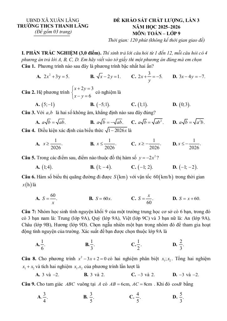Trích dẫn Đề khảo sát Toán 9 lần 3 năm 2025 – 2026 trường THCS Thanh Lãng – Phú Thọ: