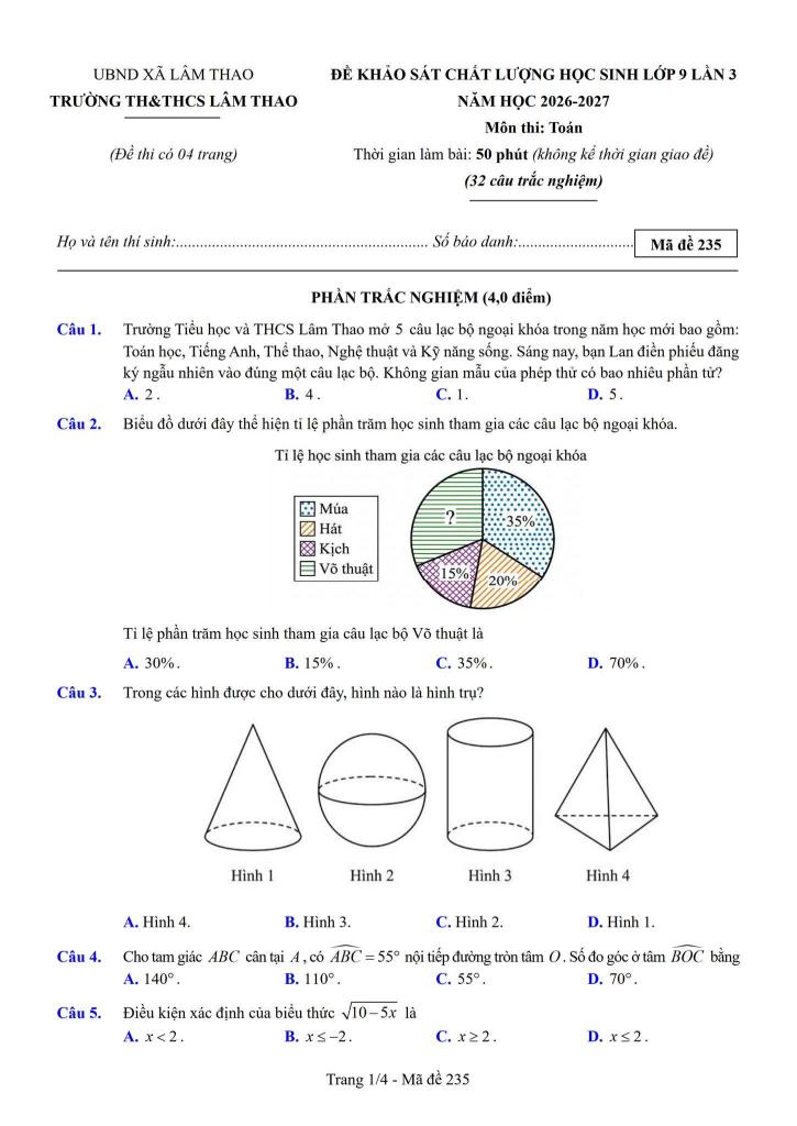 Trích dẫn Đề khảo sát Toán 9 lần 3 năm 2026 trường TH&THCS Lâm Thao – Bắc Ninh: