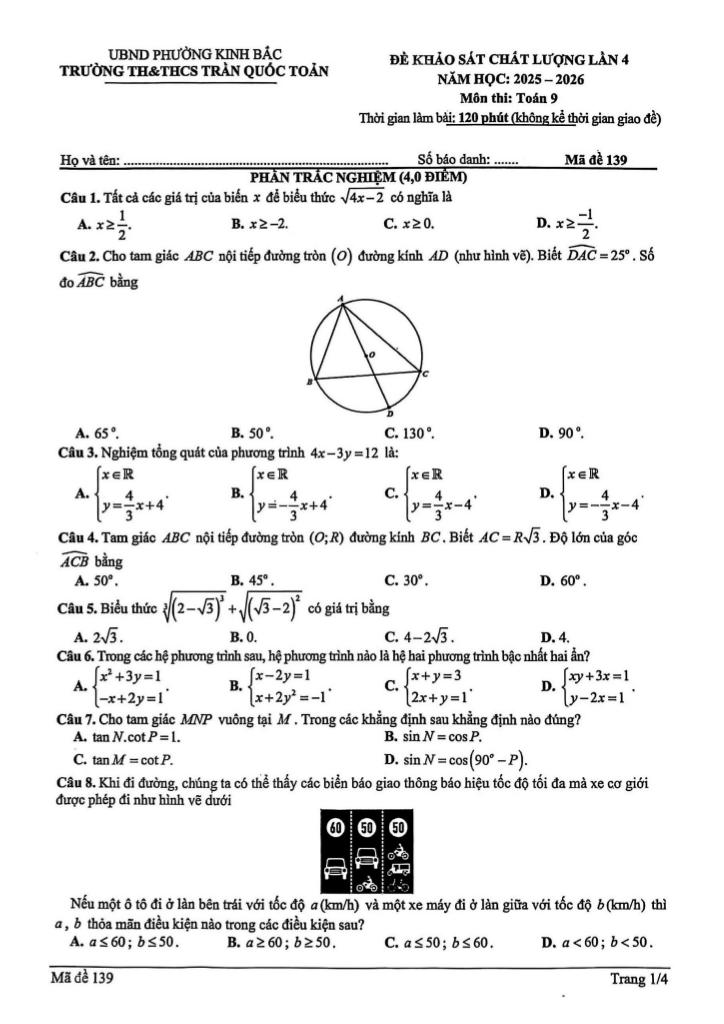 Trích dẫn Đề khảo sát Toán 9 lần 4 năm 2025 – 2026 trường TH&THCS Trần Quốc Toản – Bắc Ninh: