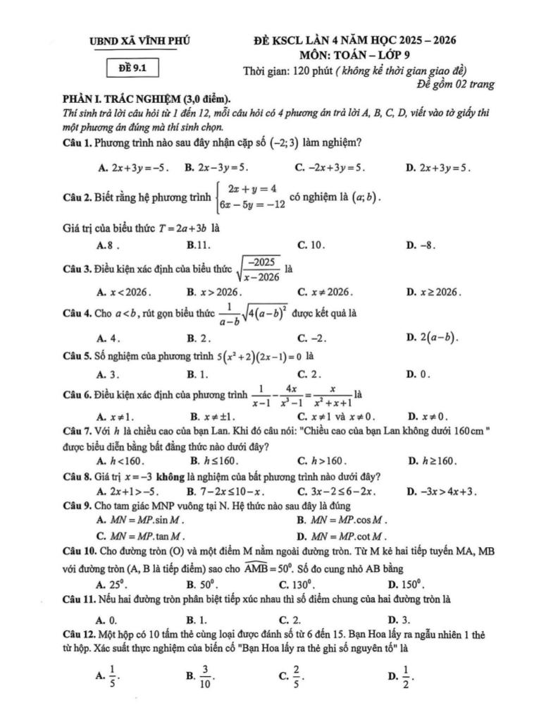 Trích dẫn Đề khảo sát Toán 9 lần 4 năm 2025 – 2026 xã Vĩnh Phú – Phú Thọ: