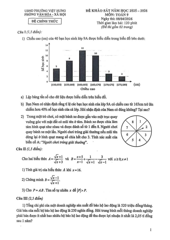 Trích dẫn Đề khảo sát Toán 9 năm 2025 – 2026 phường Việt Hưng – Hà Nội: