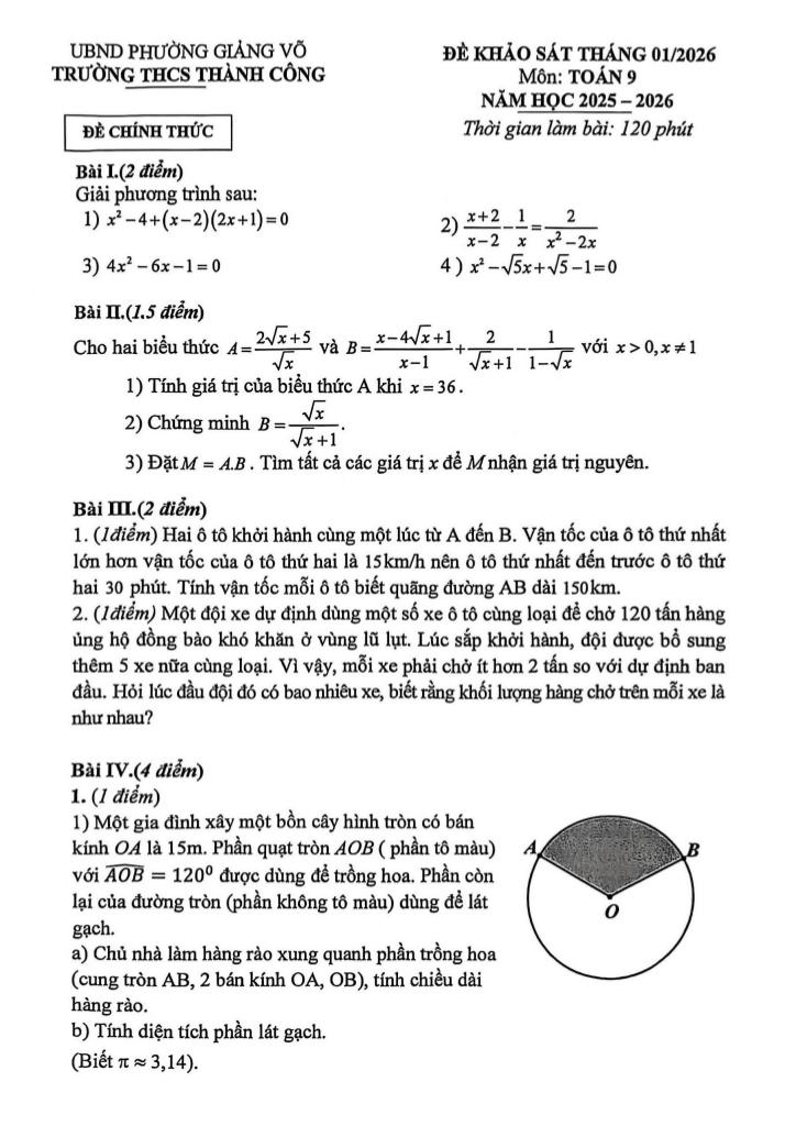 Trích dẫn Đề khảo sát Toán 9 tháng 1 năm 2026 trường THCS Thành Công – Hà Nội: