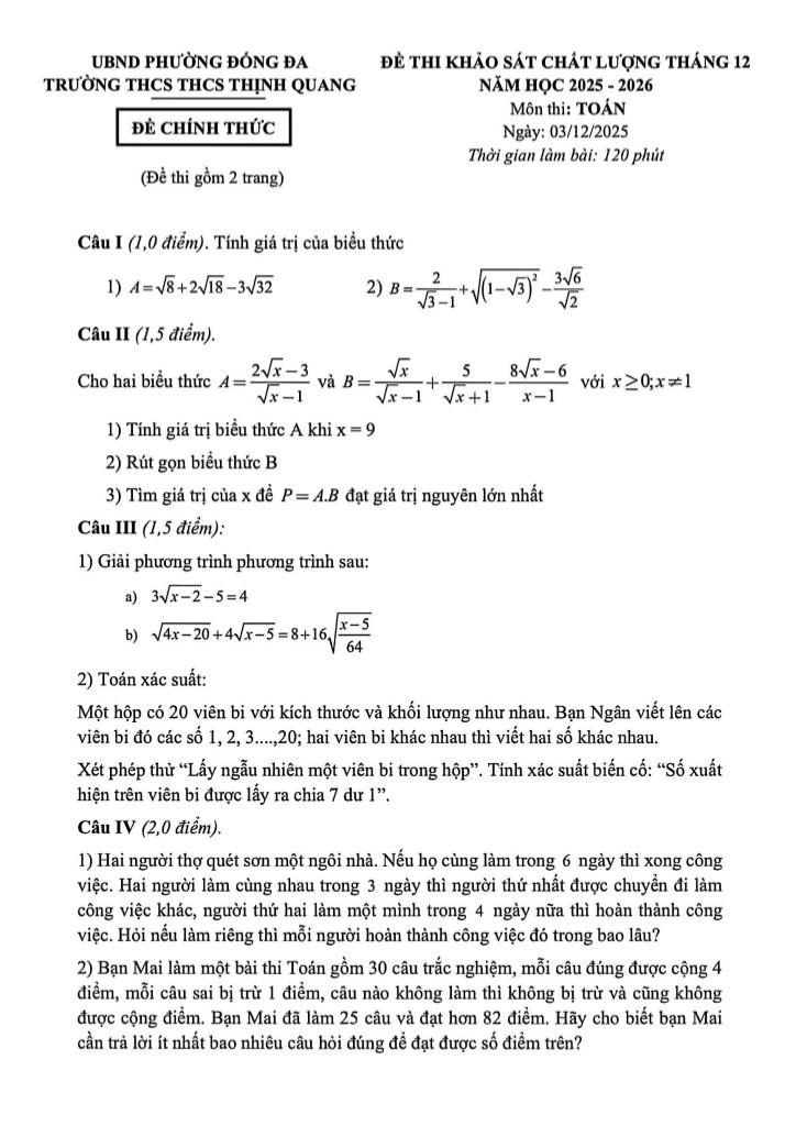 Trích dẫn Đề khảo sát Toán 9 tháng 12 năm 2025 trường THCS Thịnh Quang – Hà Nội: