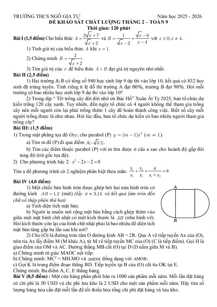 Trích dẫn Đề khảo sát Toán 9 tháng 2 năm 2026 trường THCS Ngô Gia Tự – Hà Nội: