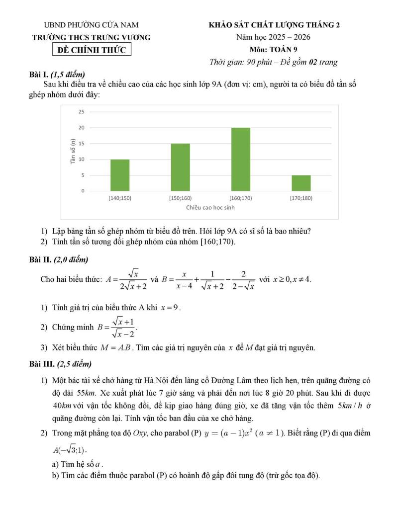 Trích dẫn Đề khảo sát Toán 9 tháng 2 năm 2026 trường THCS Trưng Vương – Hà Nội: