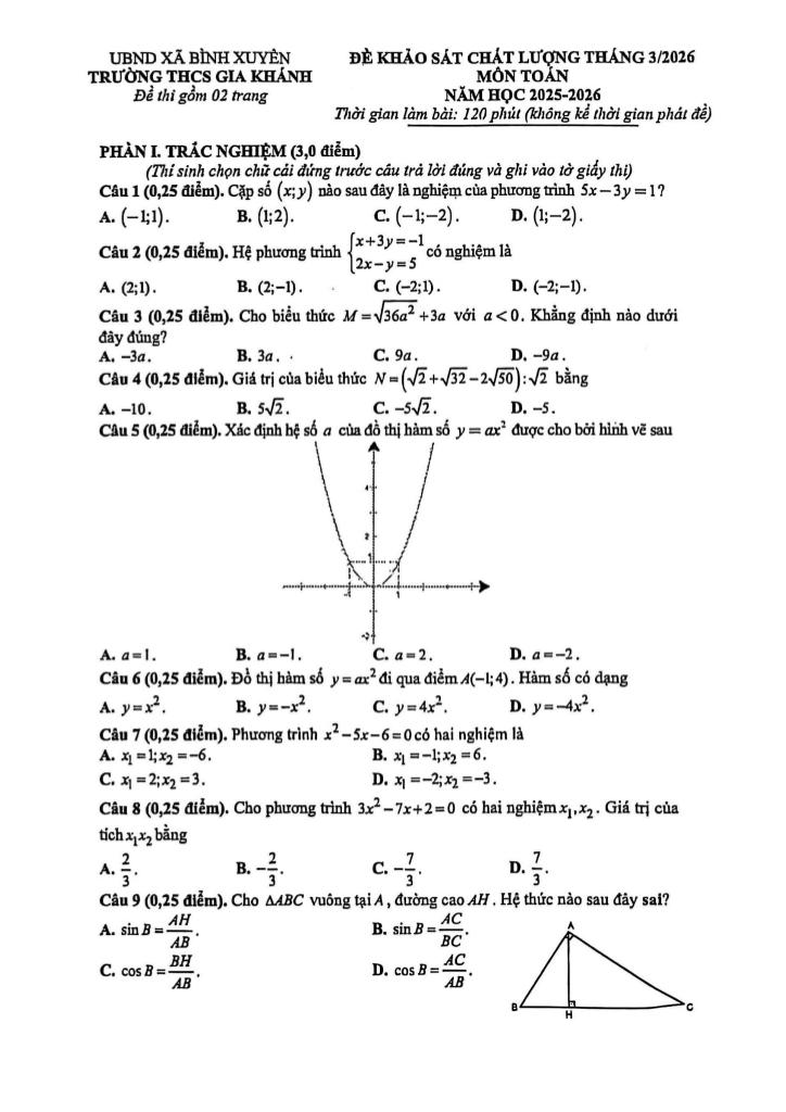 Trích dẫn Đề khảo sát Toán 9 tháng 3 năm 2026 trường THCS Gia Khánh – Phú Thọ: